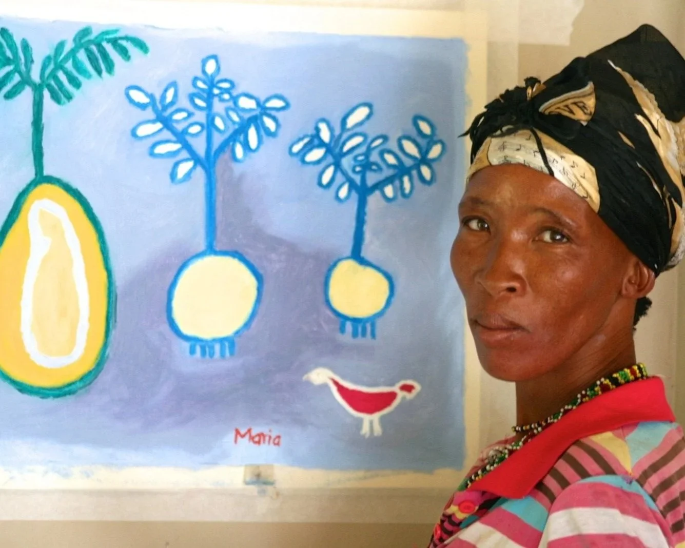 Maria Fritz was a self-taught San artist and a member of the Omba Arts community from the Kalahari region of Namibia. Working primarily in oil, her paintings explored the flora, fauna, and traditional narratives of her community. Fritz’s Mamaba Blaar (Anti-Venom Against Black Mamba) (2015) has been included in international contemporary art collections, demonstrating her engagement with both indigenous subjects and broader conversations in global art. Her practice reflecteds a deep attunement to environment and cultural memory, bridging local lived experience with visual expression.